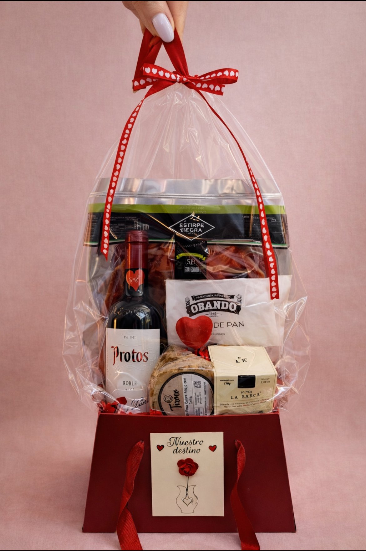 Sorprende con nuestros packs de San Valentín. Te presentamos “NUESTRO DESTINO” en el que incluye una caja regalo con vino Protos de Ribera del Duero, Jamón ibérico Cebo de Campo de Extremadura, láminas de pan Obando, cuña de queso curado de Tenerife “Tixoco” de cabra y vaca y un paté La Barca.