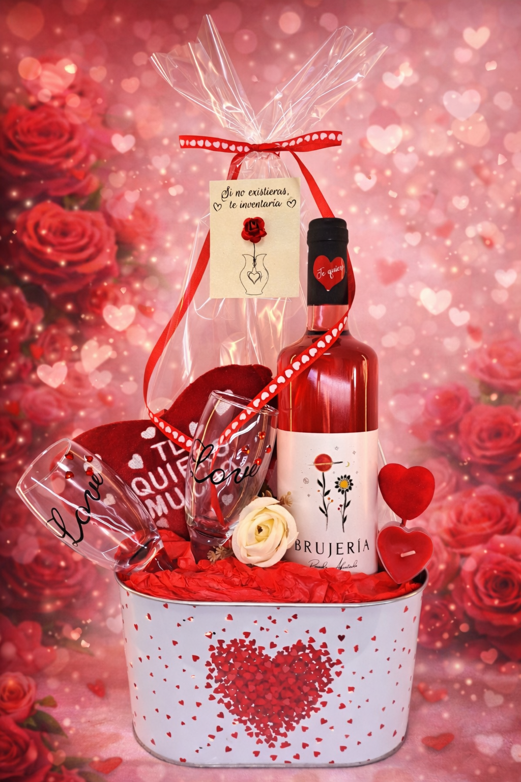 1. Sorprende con nuestros packs de San Valentín. Te presentamos “SI NO EXISTIERAS, TE INVENTARÍA” en el que incluye una botella de vino Rosado Afrutado de Tenerife, juego de dos copas “love” , peluche en forma de corazón con “te quiero” y nuestra particular decoración acompañada de la  tarjeta personalizada “SI NO EXISTIERAS, TE INVENTARÍA” por tan solo 35.00€
