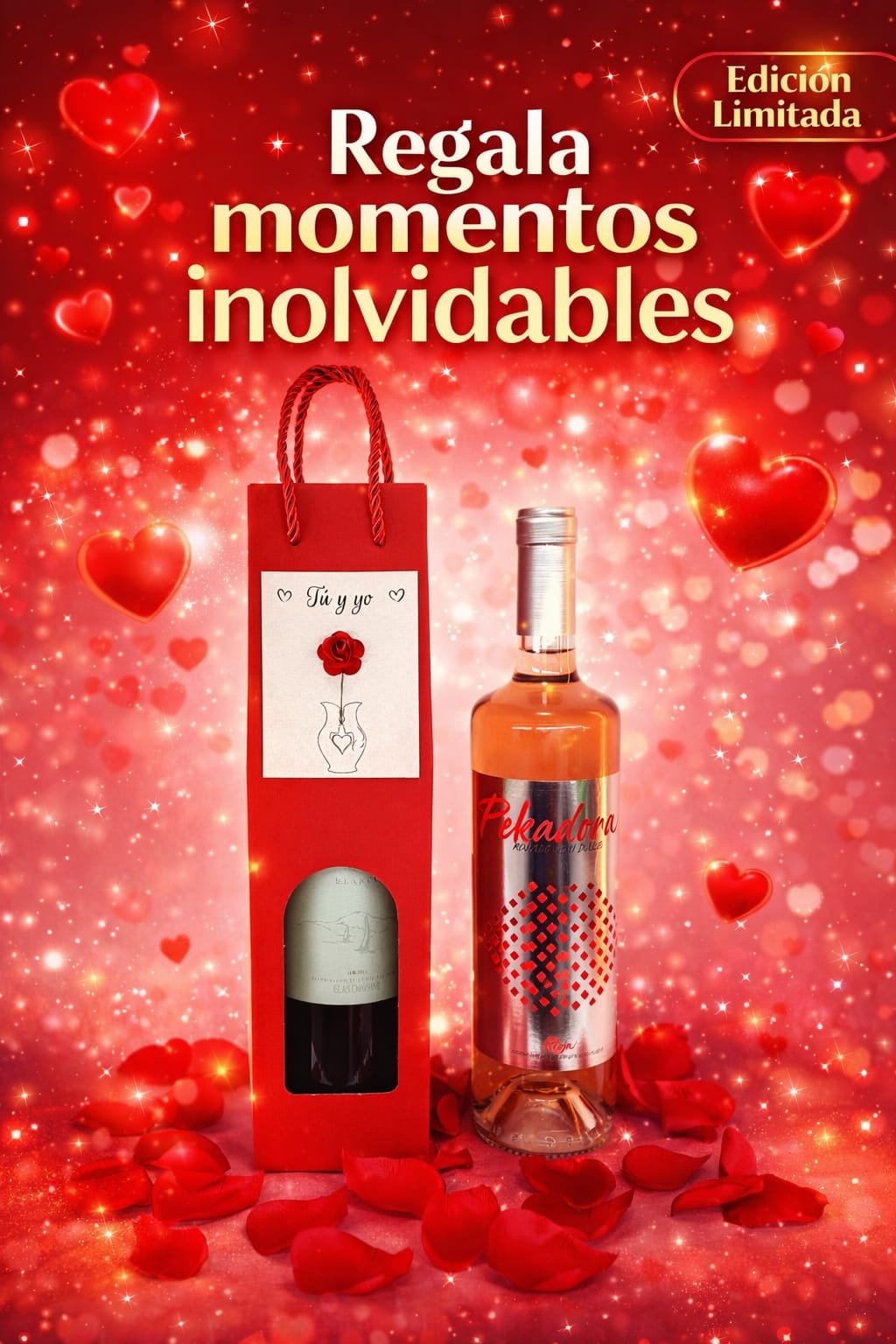 Sorprende con nuestros packs de San Valentín. Te presentamos “Tu y yo” en el que incluye una botella de vino Rosado Dulce con estuche decorado con nuestra tarjeta personalizada “Tu y yo” por tan solo 12€.